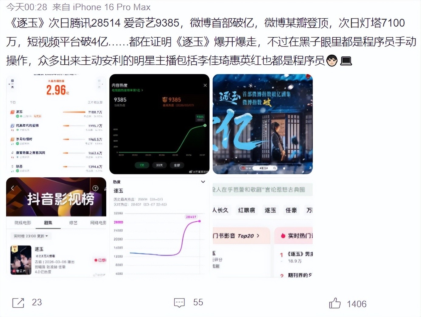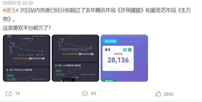 这样的情况出现,部分网友质疑《逐玉》的数据是程序员手动操作的,但我们要知道,这部剧开播第二天,就成为首部微博指数破亿的剧集,次日灯塔达到7100万,短视频平台直接破4亿。